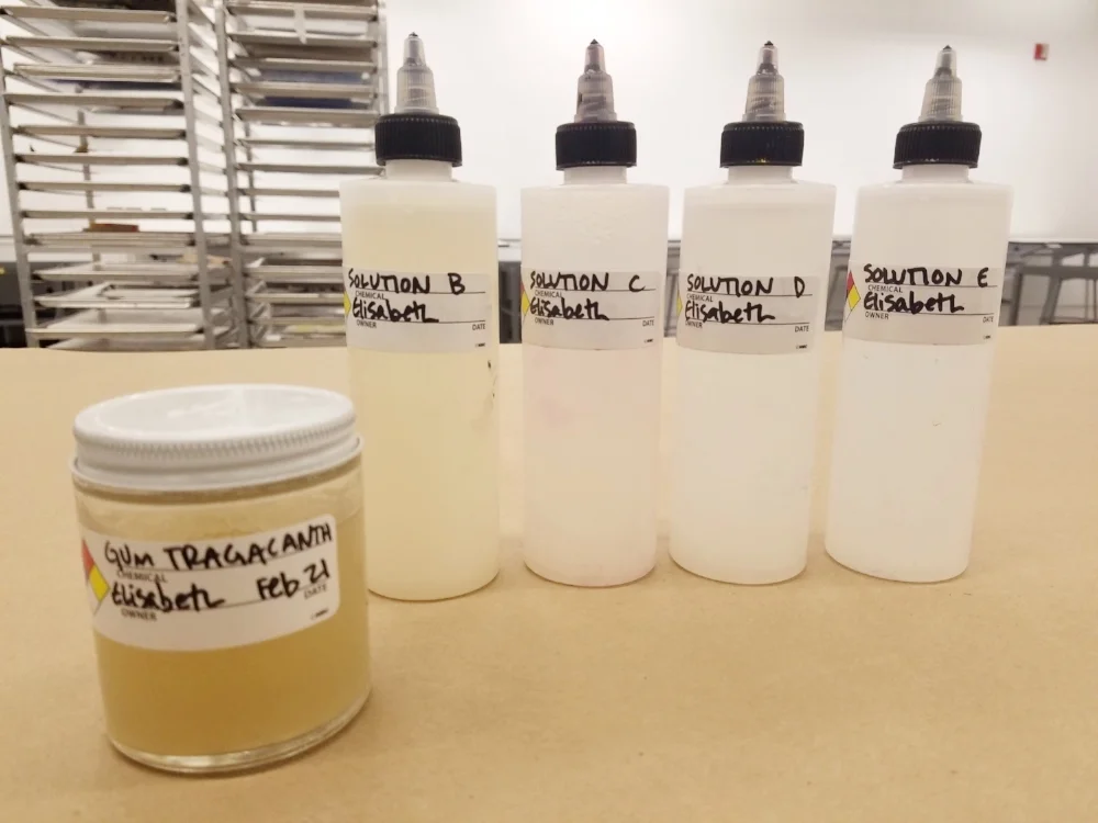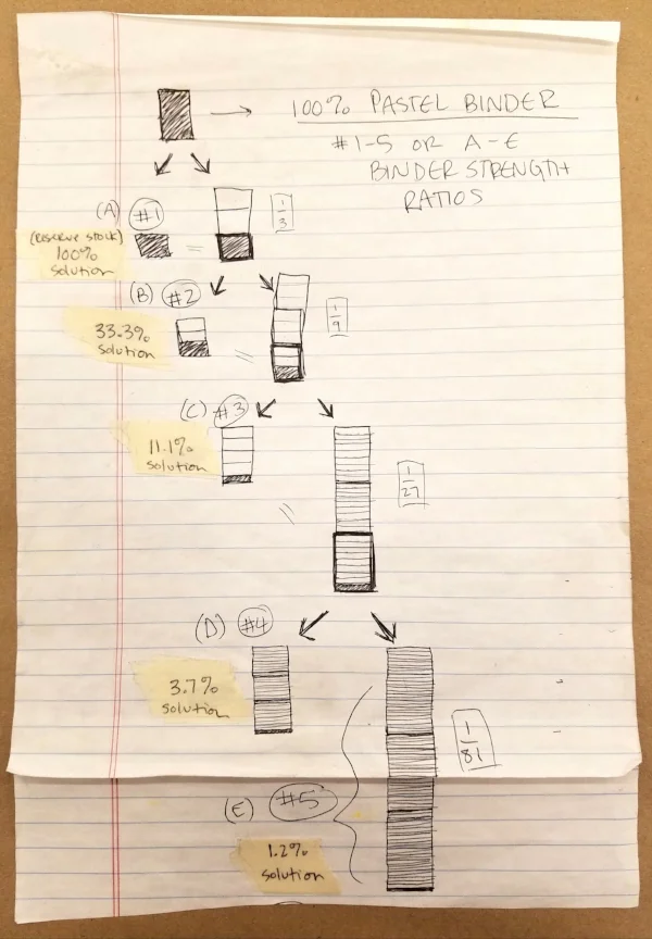 Each pigment has different chemical and behavioral qualities, making some very resistant to interaction and others super compliant. To accommodate some of these stark personality differences, we use the binder at various strengths or dilutions. This is not all that dissimilar from adjusting the oil to pigment ratio to make oil paint. Anyway, there’s a range of different dilutions that accommodate the vast variety of pigments for pastel making that all stem from the gum trag, which is too overpowering to actually use at full strength. Here’s a super useful diagram that I drew out while I was first trying to understand the dilutions/solutions, I’m sure you’ll find it easy to navigate: